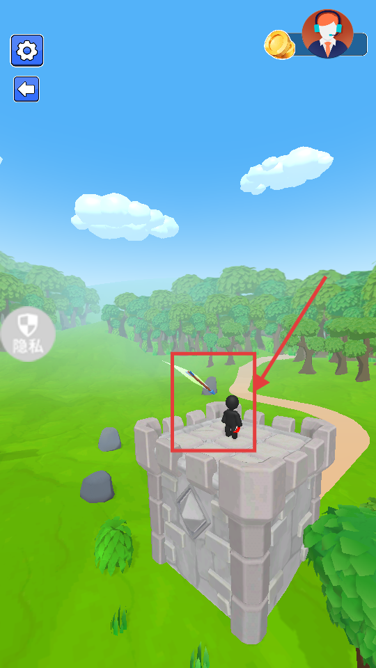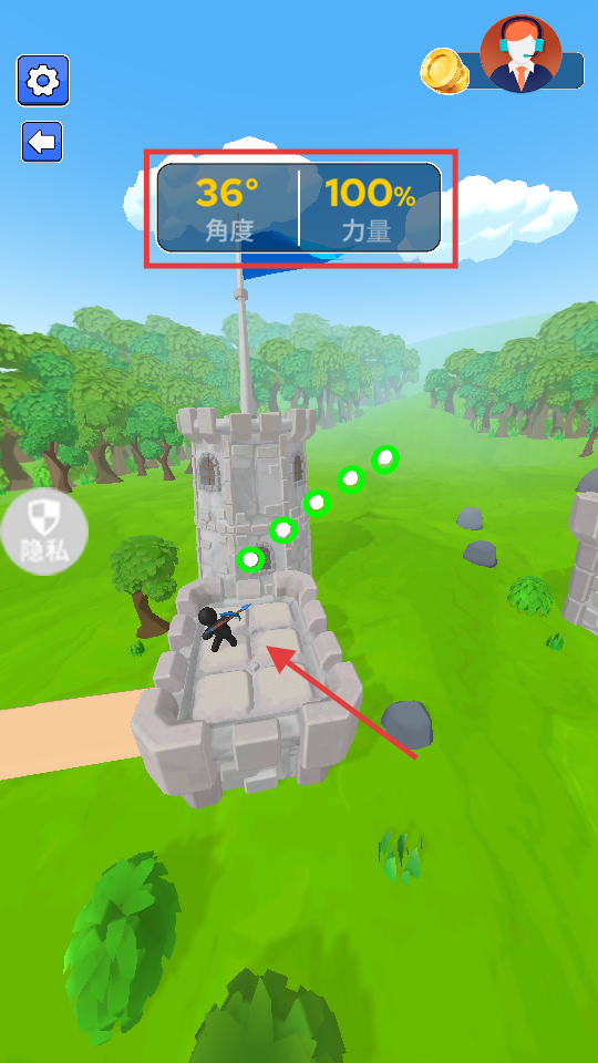 2、关注角度36°、力量100%,利用城堡地形,瞄准敌人精准发射弓箭。