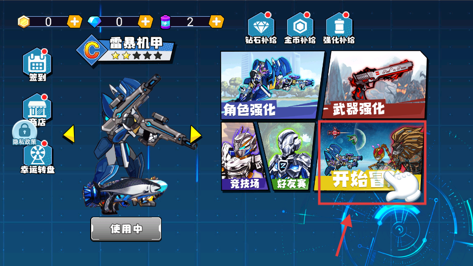 1、主界面点击“开始冒险”,进入射击关卡,可先强化角色武器后开启战斗。