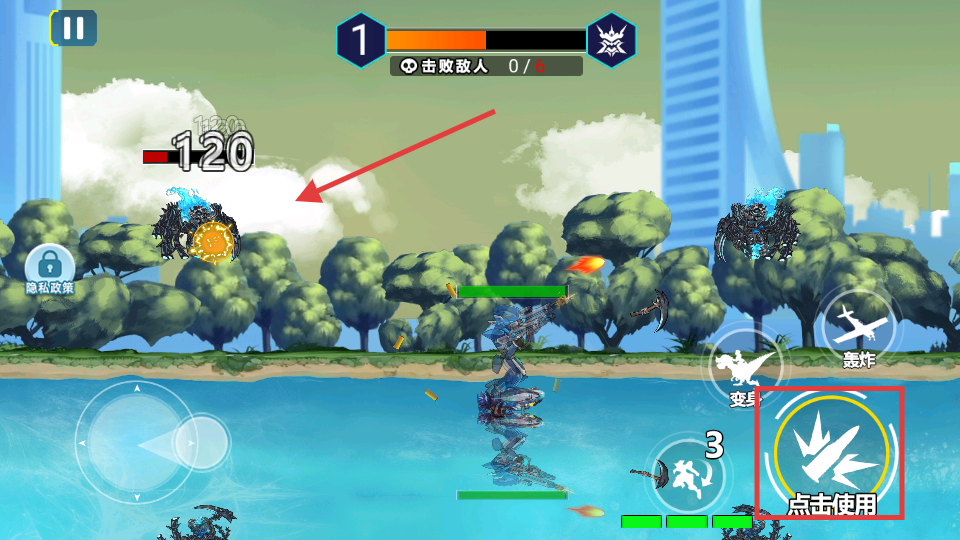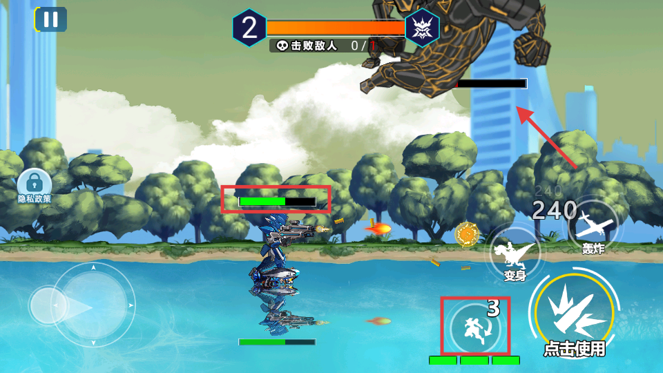 3、关注自身血量,对敌人持续射击,保留变身次数,根据敌人血量调整攻击节奏。