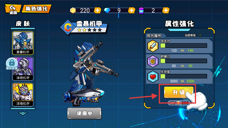 1、在角色强化界面点击升级,消耗资源提升机甲攻击、防御、生命值,强化战斗能力。