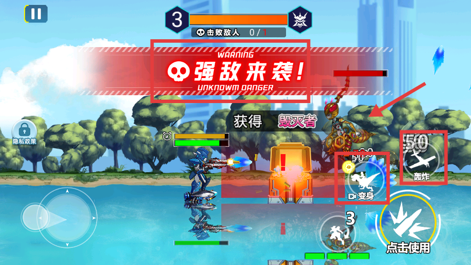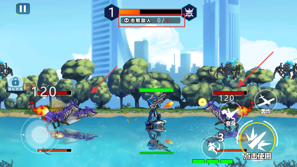 2、战斗时关注击败敌人目标,用射击、变身、轰炸技能,优先攻击低血量敌人完成击杀。