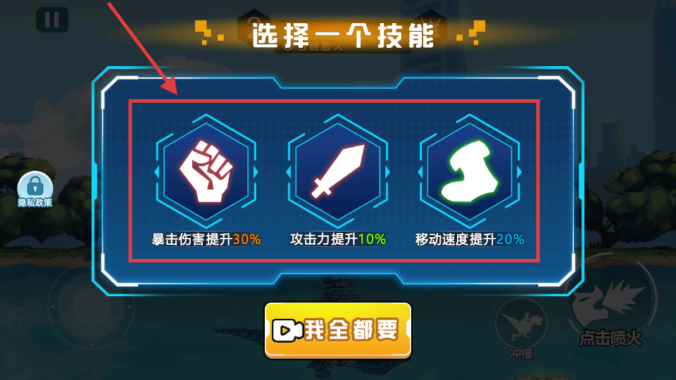 3、技能选择按需选,追求爆发选暴击,持续输出选攻击,灵活拉扯选移速提升。