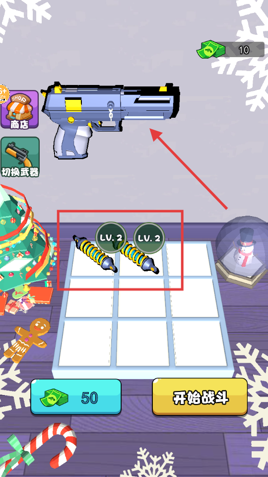 1、合成两个同等级的零件可提升武器等级,组装好武器后就能点击开始战斗进入关卡。