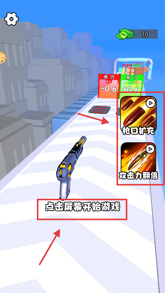 2、开始游戏前可选择枪口扩充或攻击力翻倍的增益效果,选好后点击屏幕开始闯关。