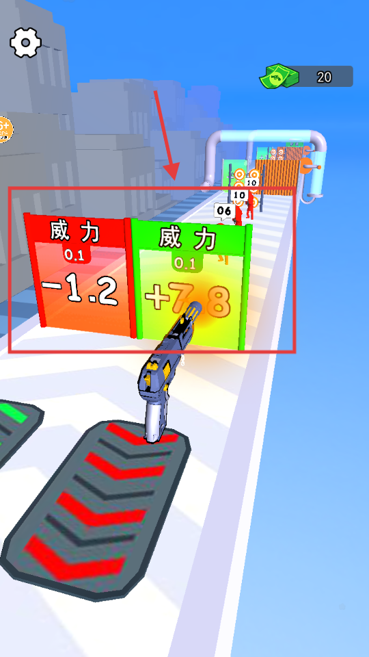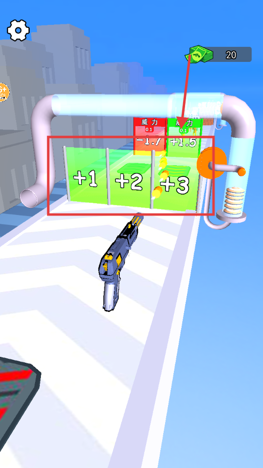3、跑酷过程中遇到加一加二加三的绿色区域,要优先接触高数值的加成来提升武器属性。
