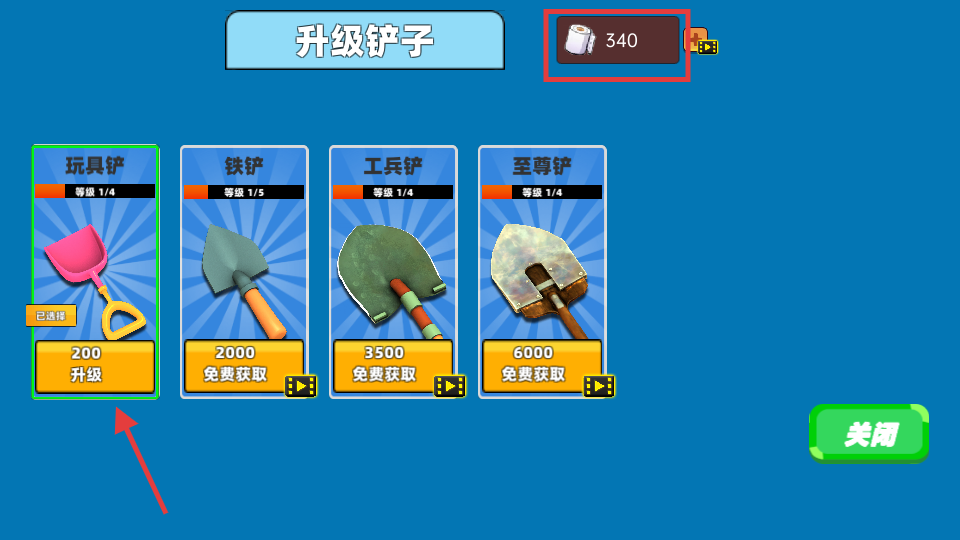 4、进入升级界面后选择已有的玩具铲,消耗两百卷纸进行升级提升工具挖掘效率。