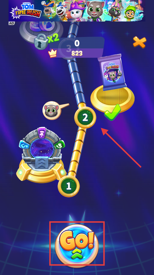 1、点击底部带有向上箭头的Go按钮,即可开启汤姆猫的时光跑酷冒险。