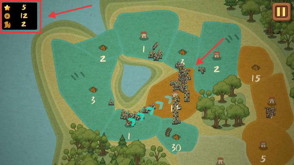 3、战斗过程中,需关注左上角的资源与兵力数值,合理分配部队发起进攻。
