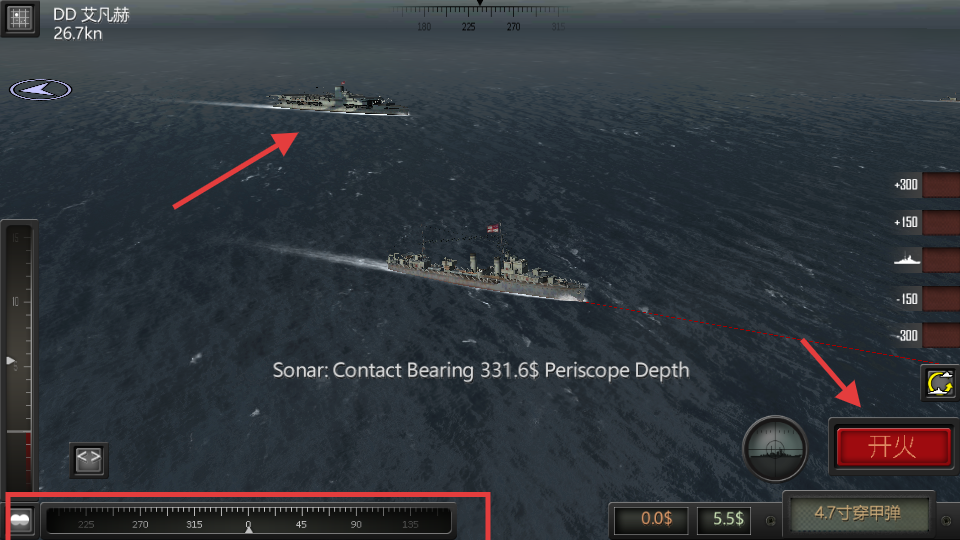 4、调整瞄准刻度对准敌舰,状态合适时点击开火,注意弹药消耗与己方舰船生存状态。