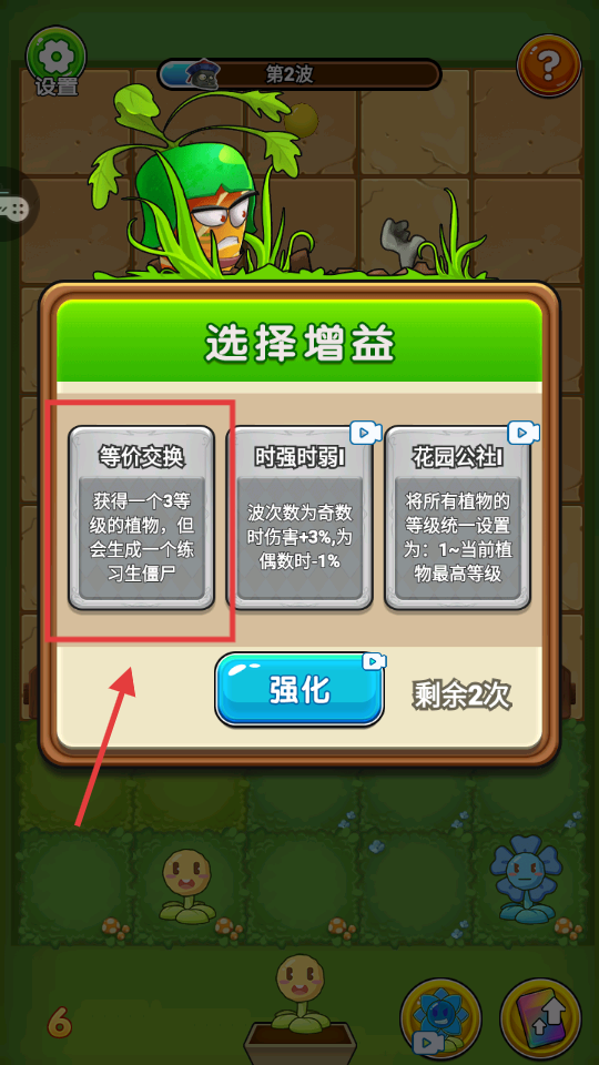 2、第二波前选“等价交换”增益,获3级植物提升战力,虽生练习僵尸但可速强防线,点击强化生效。