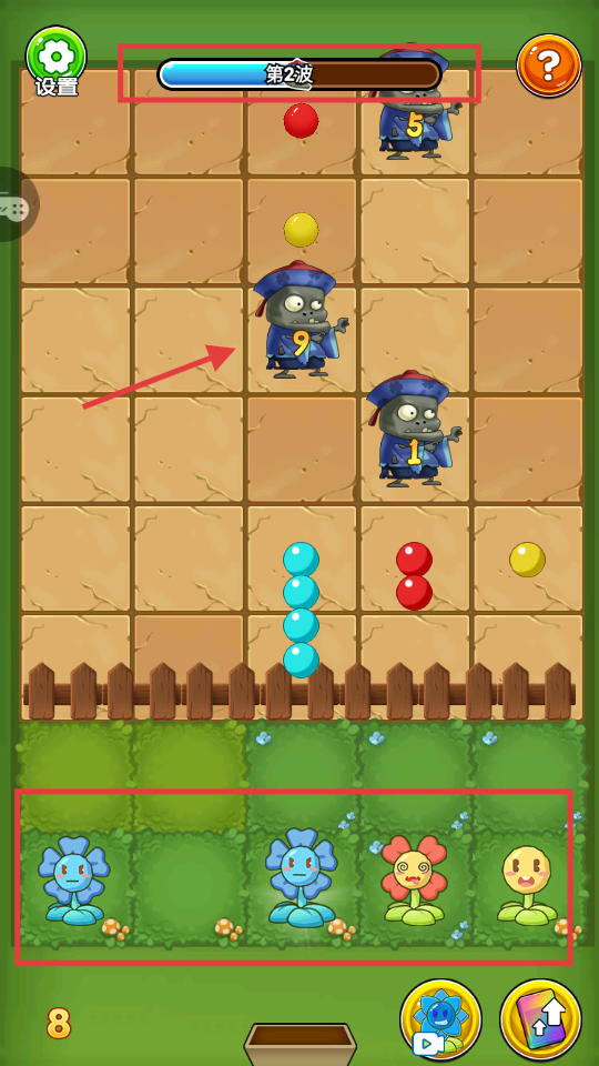 3、第二波时观察下方植物布局,多种植物配合攻击,注意波次进度,应对不同等级僵尸,巩固防线。