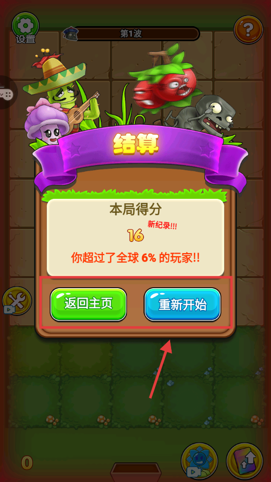 4、结算后可点“重新开始”优化策略,或“返回主页”领奖励、解锁新内容,利用得分提升植物战力。