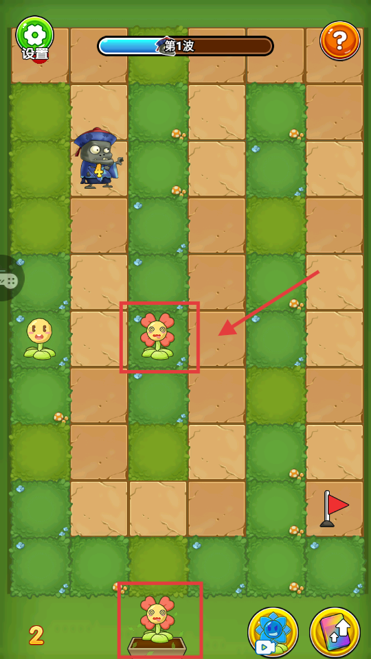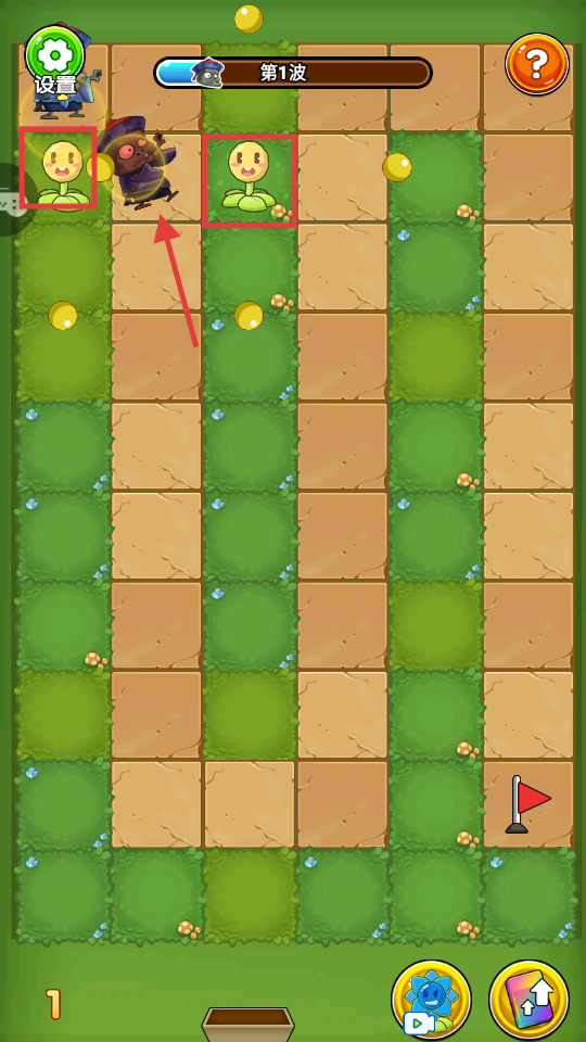 2、第一波僵尸来袭时,利用初始植物布置在僵尸路径,借助它们的攻击阻挡僵尸推进。
