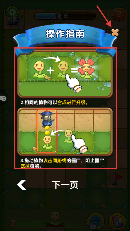 3、牢记操作指南,相同植物可合成升级,拖动植物能攻击同路线僵尸,提升防御效率。