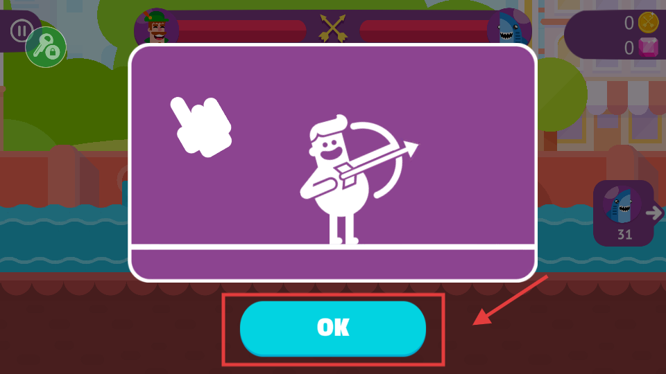 1、点击蓝色OK按钮,确认提示后可进入游戏操作环节,开启射箭对战。