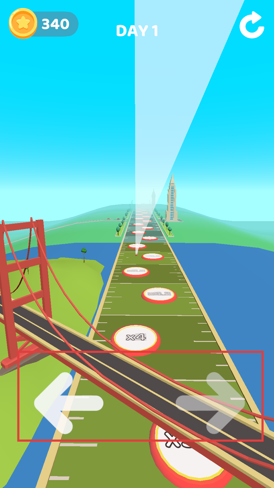 3、遇到桥梁等路段,通过左右箭头操作,引导橄榄球到达更高增益区域。