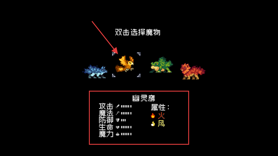2、双击【幽灵鹰】选择魔物,查看【攻击】-【魔法】-【防御】-【生命】-【魔力】及【火】-【风】属性,按需培养。