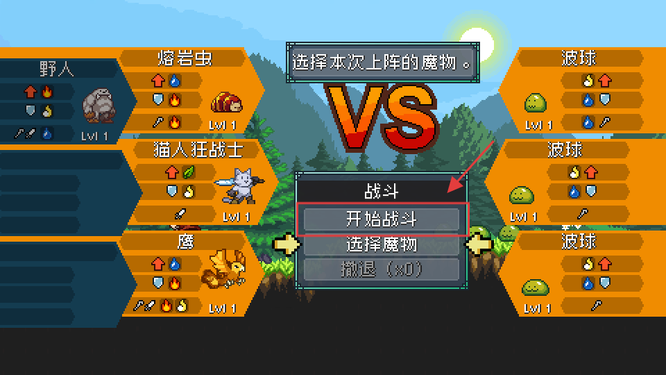 3、选好上阵魔物后,点击【开始战斗】进入3V3战术回合,可调整阵容或撤退(次数【0】)。