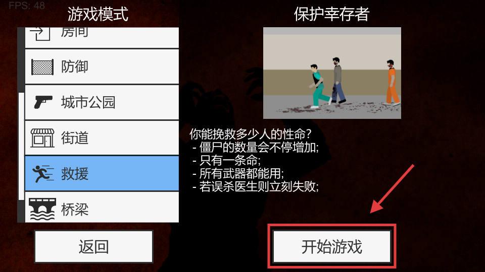 1、选择“救援”模式后,点击“开始游戏”,进入保护幸存者关卡,需注意不误杀医生且僵尸数量会增加。