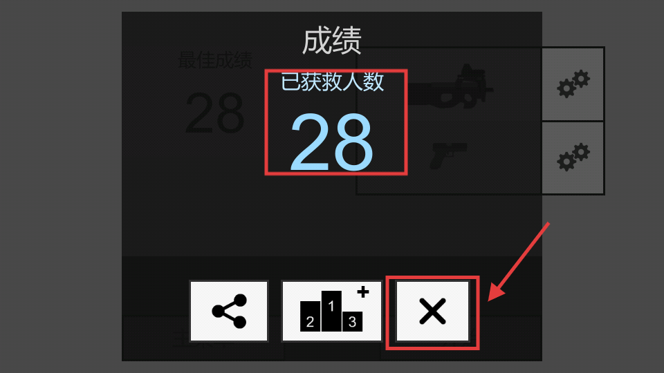 4、游戏结束后查看已获救人数,点击叉号可退出成绩界面,可重新挑战提升救人数量。