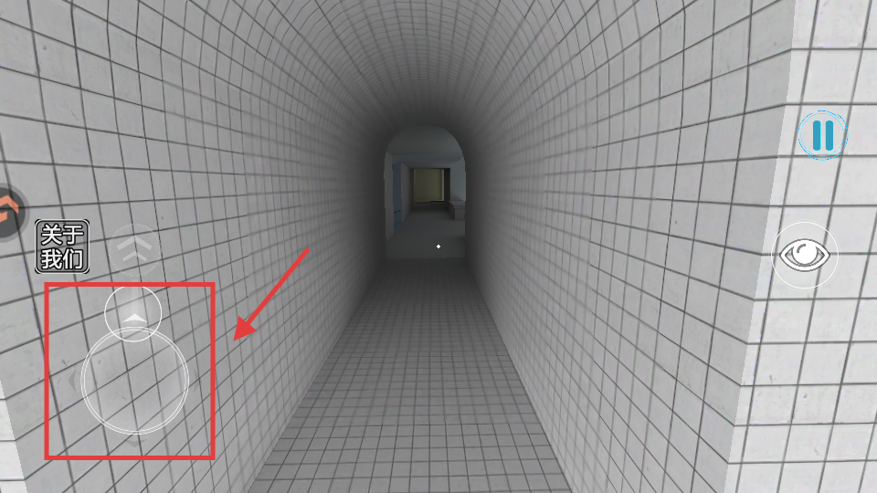 2、通过左下角移动摇杆操控角色移动,在瓷砖走廊中探索,寻找解谜线索。