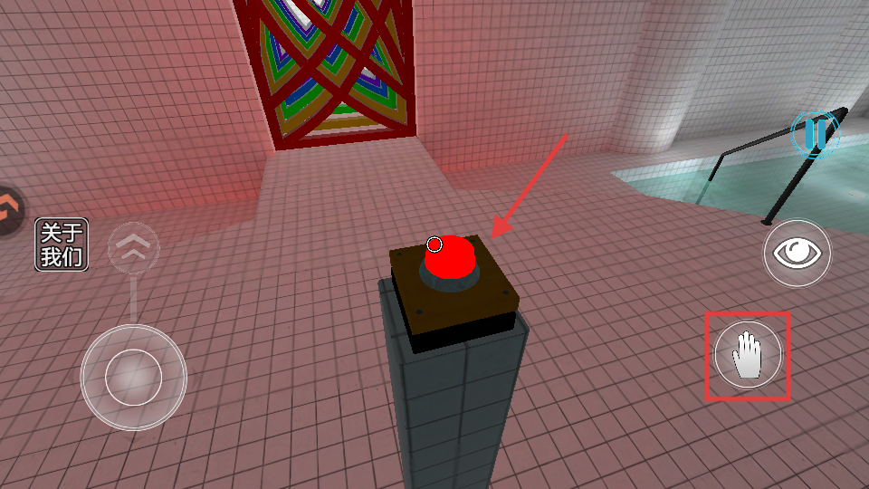 4、靠近红按钮装置时,点击右下角手图标进行互动操作,推动解谜进程。