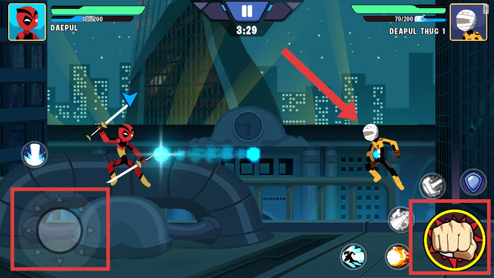 2、进入战斗场景后,利用左侧的虚拟摇杆控制角色移动,点击右侧的【拳头图标】进行攻击,瞄准红框内的敌人发起进攻。