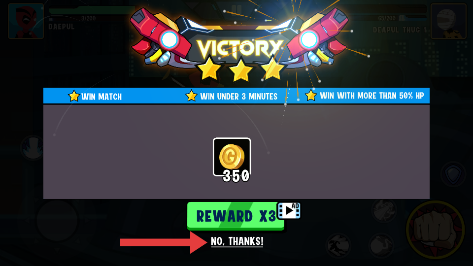 4、战斗胜利后,在奖励界面查看获得的金币,可选择观看广告加倍奖励或点击【NO,-THANKS!】按钮,继续游戏或返回主界面。