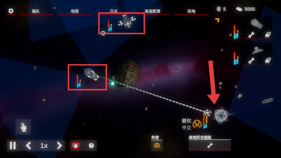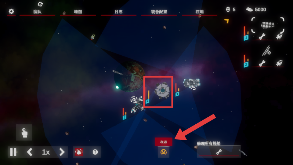 3、当接近目标地点,如【霸权-中立】建筑时,点击【攻击】按钮,操控舰船对目标发起攻击。