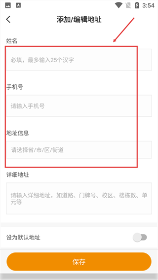 4、依次填写【姓名】、【手机号】、【地址信息】等必填内容,完成收货地址的录入。