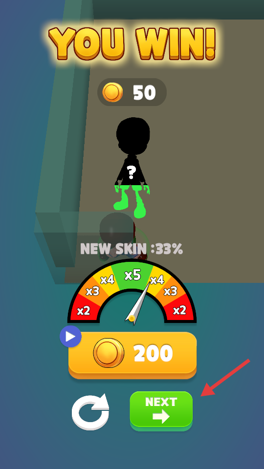 4、获胜后,可获得金币(如50金币),点击“NEXT”按钮,进入下一关继续挑战。