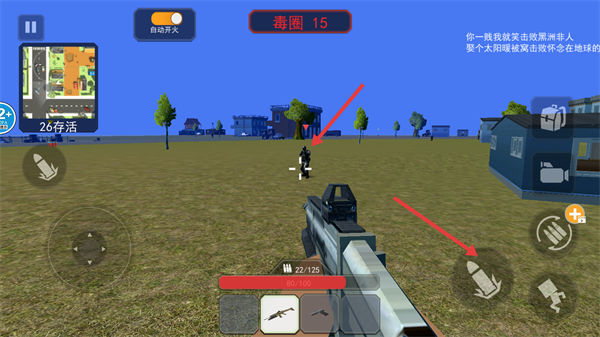 4、注意【毒圈15】,瞄准敌人后点击射击按钮攻击。