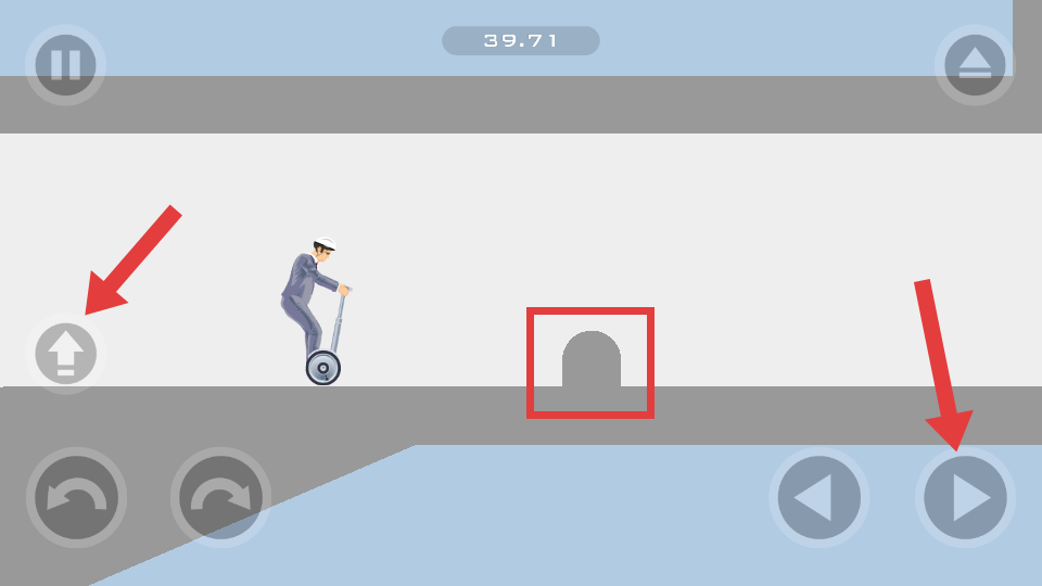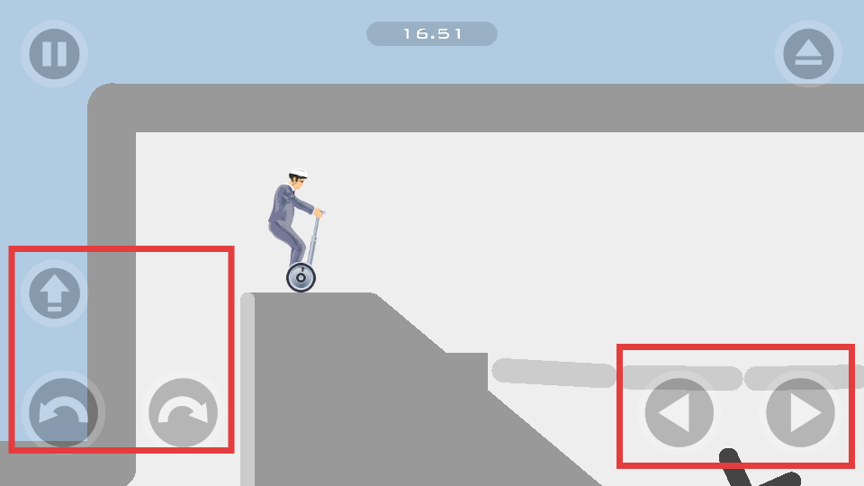 2、进入游戏关卡,通过操控红框内的【前进、后退、跳跃和翻转按钮】,控制角色驾驶独轮车移动。