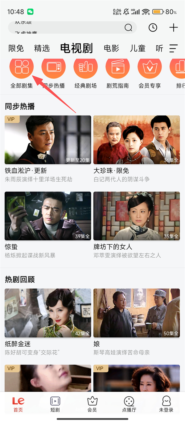 1、打开【乐视视频】App,点击顶部导航栏的【电视剧】,进入电视剧专区查找剧集呀。