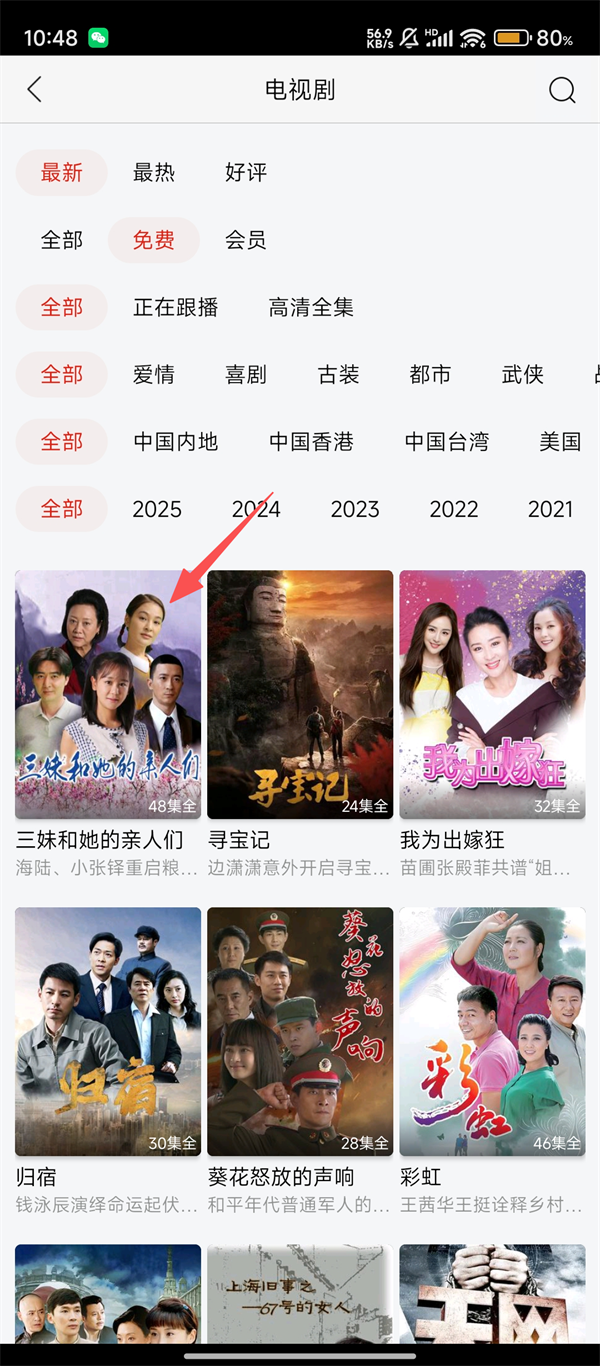 3、在筛选结果中,点击心仪的电视剧,如【三妹和她的亲人们】,进入剧集详情页呢。