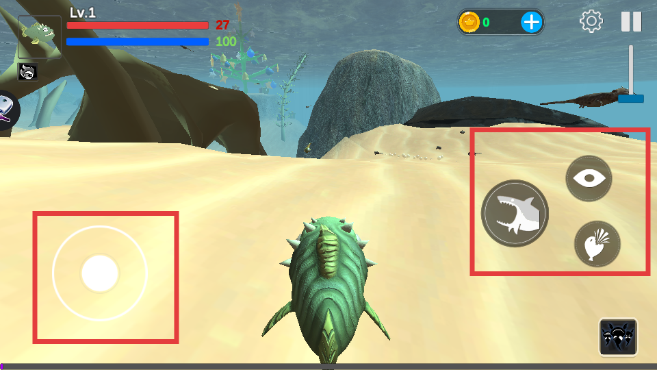 2、通过左侧【虚拟摇杆】控制鱼类移动,右侧用于操控,灵活运用这些操作探索海底。