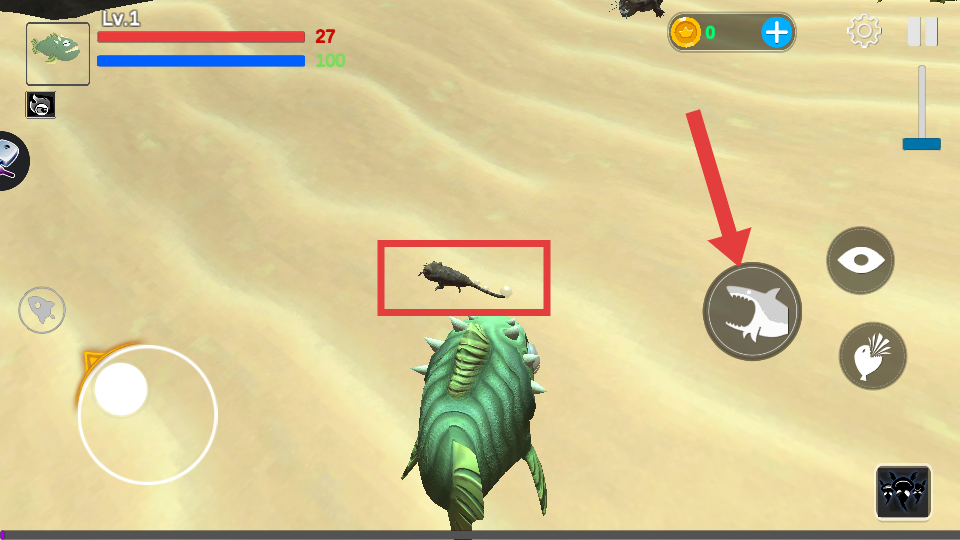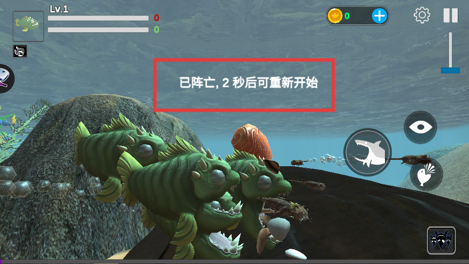 3、遇到可捕食的小鱼时,点击右侧【鲨鱼图标】发动攻击,捕食后提升自身等级和能力,注意选择比自己弱小的目标。