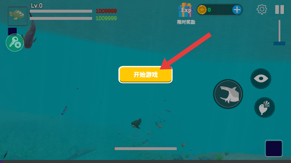 1、点击【开始游戏】按钮进入游戏,可利用内置功能菜单提前解锁高等级鱼类,快速开启海底猎杀之旅。