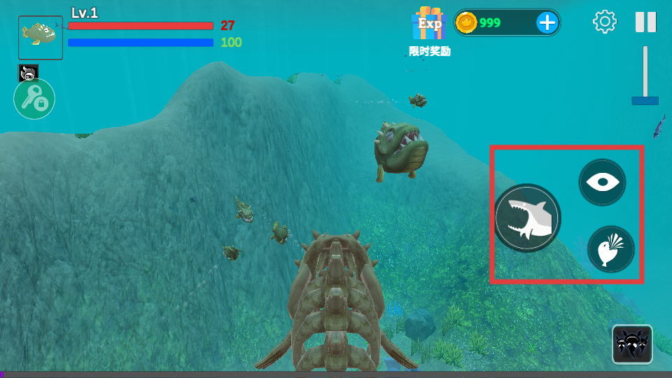 2、在海底场景中,使用方框内功能按钮进行操控鱼类,灵活探索并狩猎其他海洋生物。