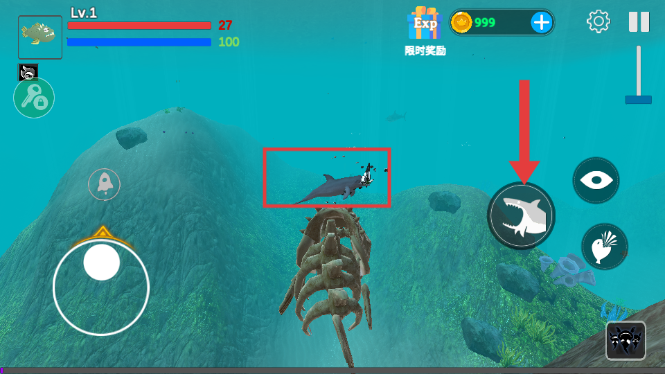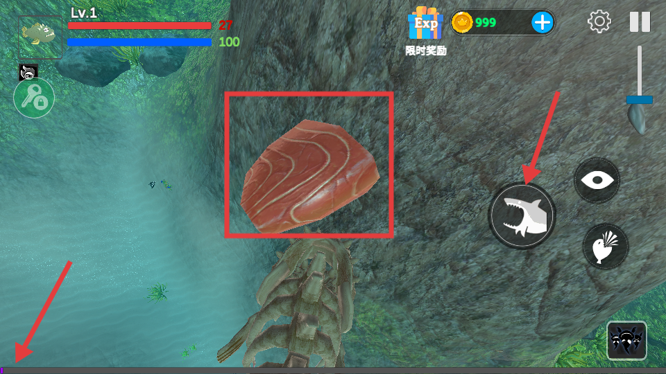 4、捕食后出现的肉块资源,点击【鲨鱼图标】进行吞噬,增加左下角经验,逐步成长为海底霸主。
