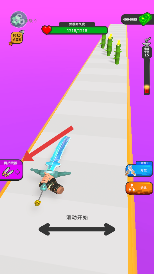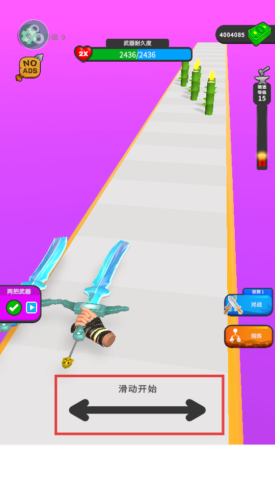 1、点击【两把武器】按钮解锁双武器形态,免广告模式下可直接获得武器强化,提升战斗能力后滑动开始游戏。