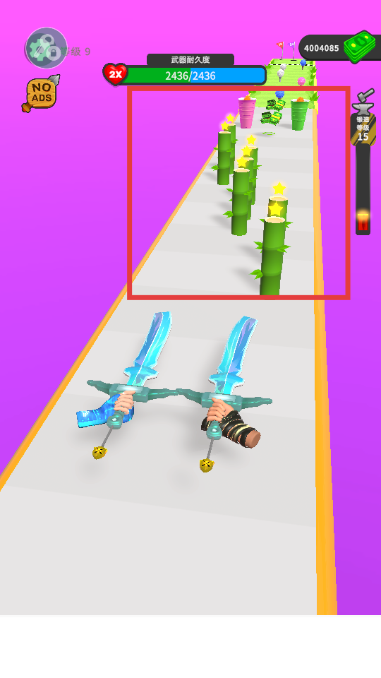 3、优先攻击带有星星的竹子障碍,免广告模式可让武器破坏效率提升,快速获取资源用于武器铸造。