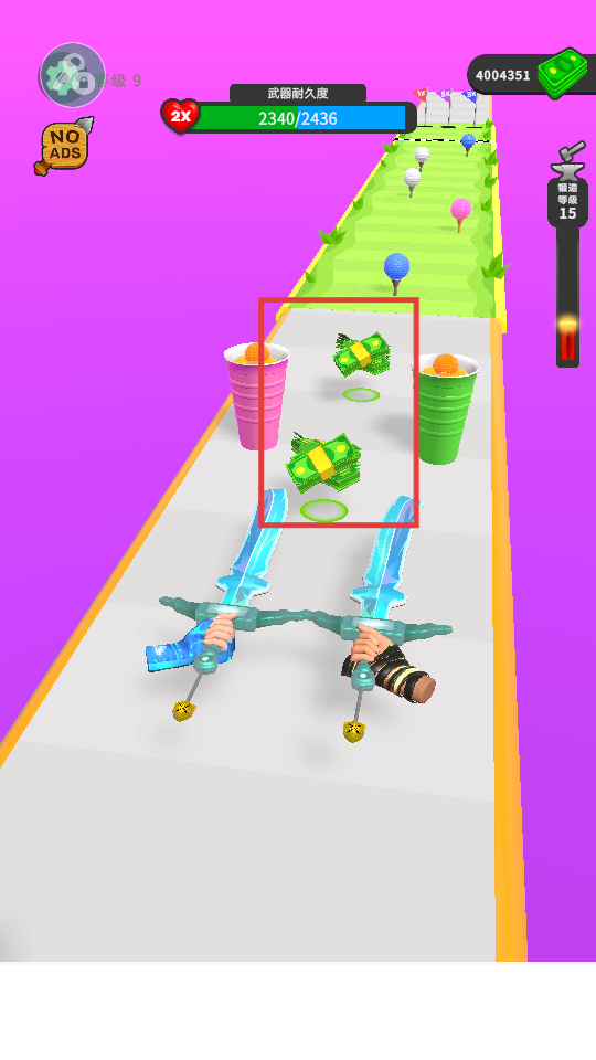 2、滑动屏幕控制双武器移动,免广告模式下武器耐久度和伤害加成更高,在赛道上灵活应对各种障碍。