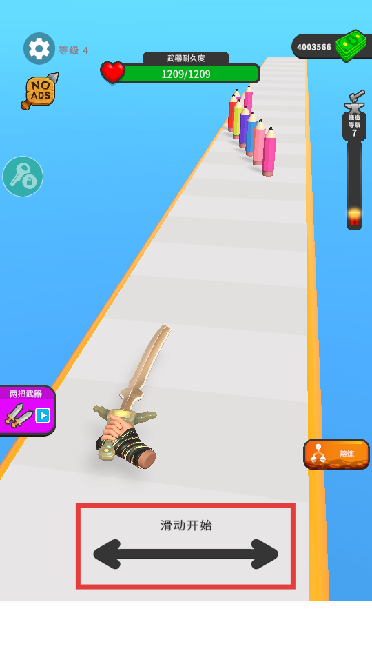 1、滑动屏幕开始游戏,利用无限金币优势,可提前解锁高级武器,在赛道上开启铸造挑战。