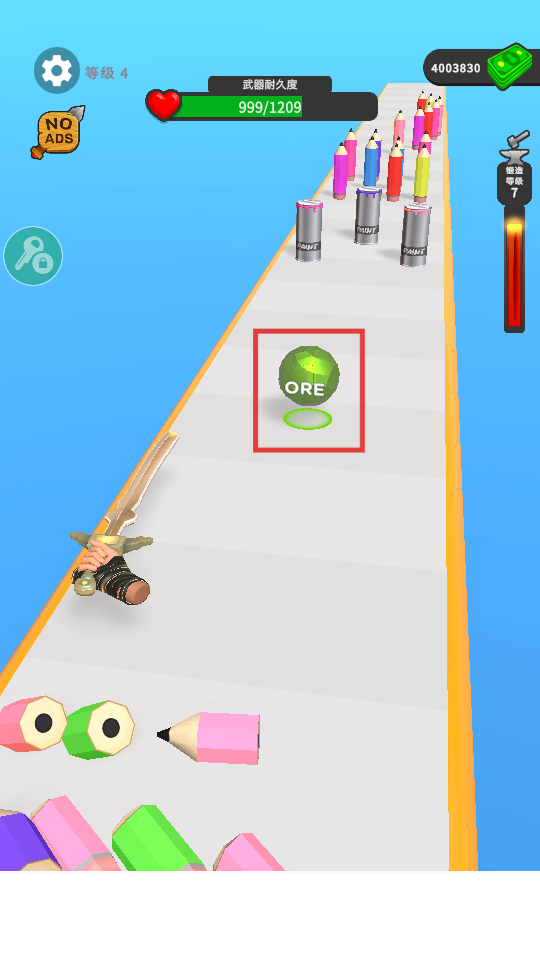 2、遇到【ORE】矿石时,借助无限金币的资源加成,优先收集用于武器铸造升级,提升武器性能。