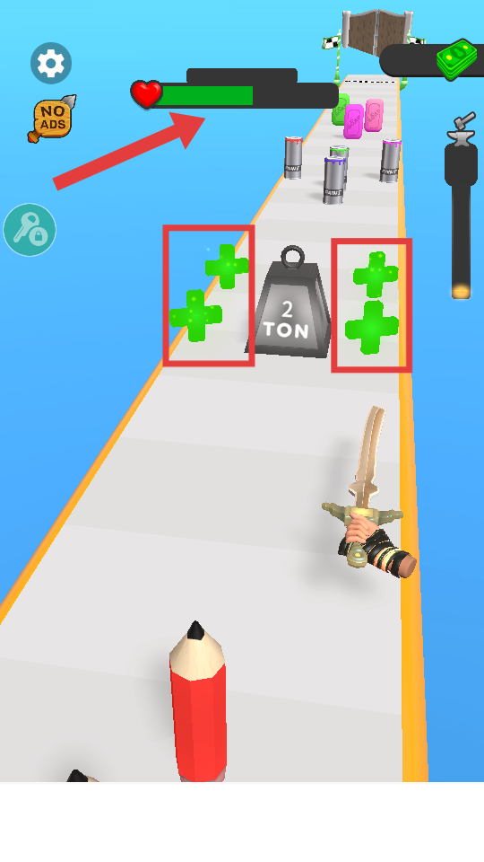 3、通过绿色加号区域时,无限金币可让武器耐久度和伤害大幅提升,轻松应对高难度障碍。