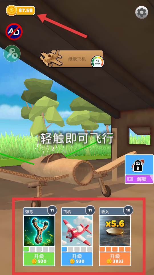 1、利用无限金币升级弹弓、飞机和收入系统,提升飞机的飞行性能和金币获取效率后,点击【轻触即可飞行】开始游戏。