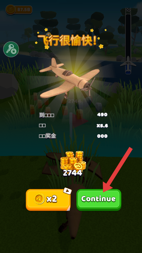 4、飞行结束后点击【Continue】按钮继续游戏,无限金币版让你可快速积累资源,不断升级飞机,挑战更高飞行记录。