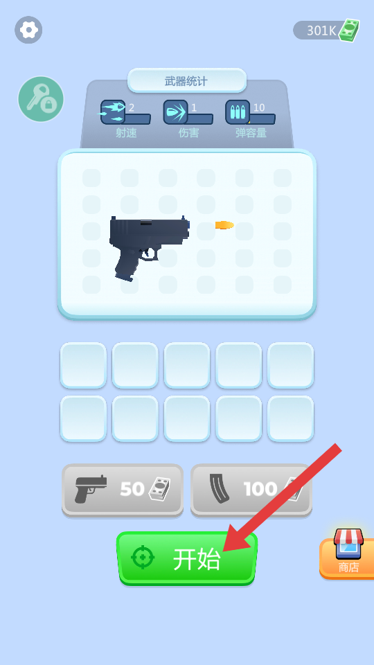 1、借助内置菜单可查看武器统计的射速、伤害、弹容量,选择合适武器后点击【开始】按钮进入战斗。