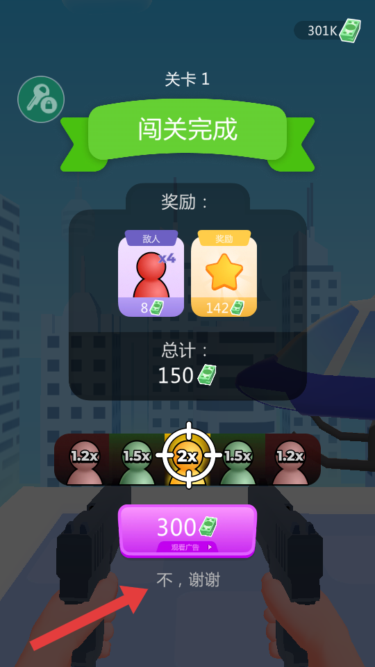 4、闯关完成后,选择“不,谢谢”跳过广告,借助内置菜单可直接领取基础奖励,积累资金用于武器升级。
